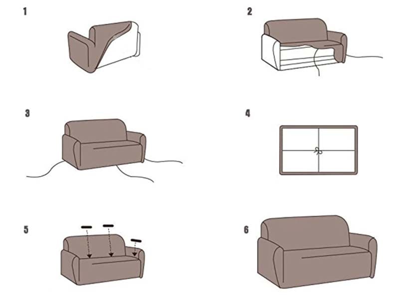Lyft sedan soffan lätt uppåt för att dra alla elastiska band från framsidan, baksidan och sidorna under soffan för att kunna fästa dem tätt tillsammans. Sätt sedan ner soffan till sitt vanliga läge, samla allt överskotts tyg och vik ner det tätt mellan armstödet och sätet vid behov.