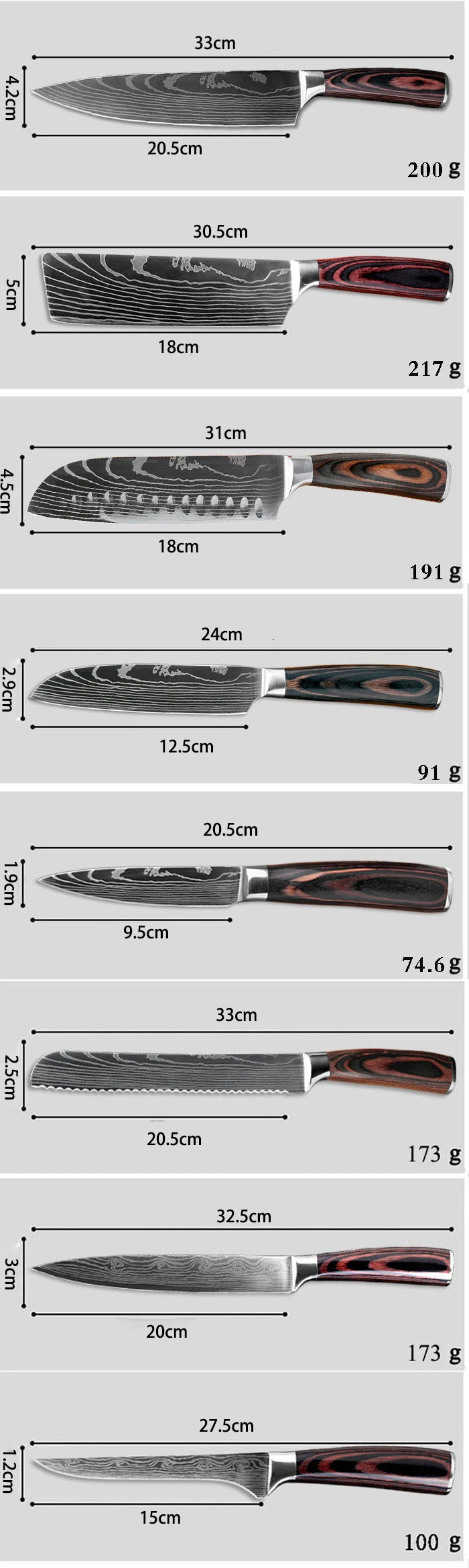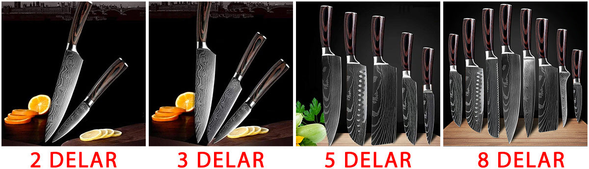 Lasergravering – Det lasergraverade damascus-mönstret med sina fina linjer gör våra vassa knivar ännu elegantare och vackrare, samt att det hjälper dig skära maten med högre precision då de förhindrar att mat fastnar vid bladet.